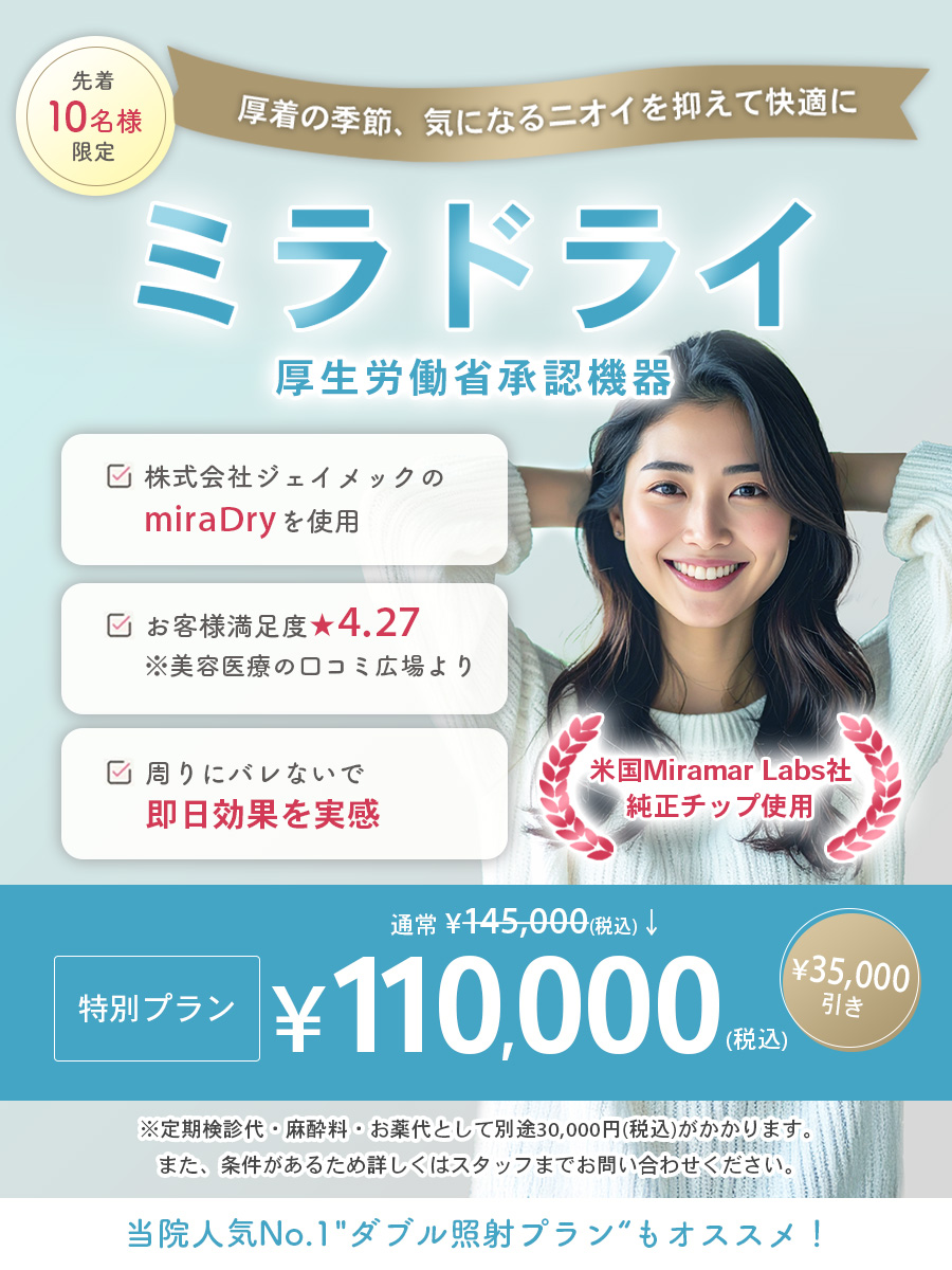ミラドライは一般的に安全性が高い施術ですが、副作用が発生する可能性があります。万が一、副作用が現れた場合には、無料で診察・処置を行います。
